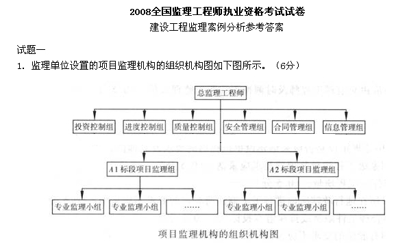一、某工程,建設(shè)單位與甲施工單位簽訂了施工總承包合同,并委托一家監(jiān)理單位實施施工階段監(jiān)理。經(jīng)建設(shè)單位同意,甲施工單位將工程劃分為A1、A2標段,并將A2標段分包給乙施工單位。根據(jù)監(jiān)理工作需要,監(jiān)理單位設(shè)立了投資控制組、進度控制組、質(zhì)量控制組、安全管理組、合同管理組和信息管理組六個職能管理部門,同時設(shè)立了A1和A2兩個標段的項目監(jiān)理組,并按專業(yè)分別設(shè)置了若干專業(yè)監(jiān)理小組,組成直線職能制項目監(jiān)理組織機構(gòu)。