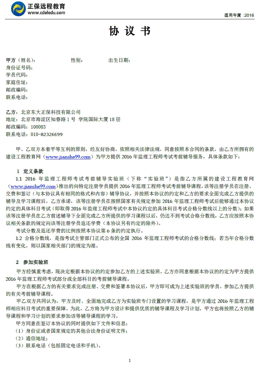 監(jiān)理工程師“實(shí)驗(yàn)班”協(xié)議書(shū)
