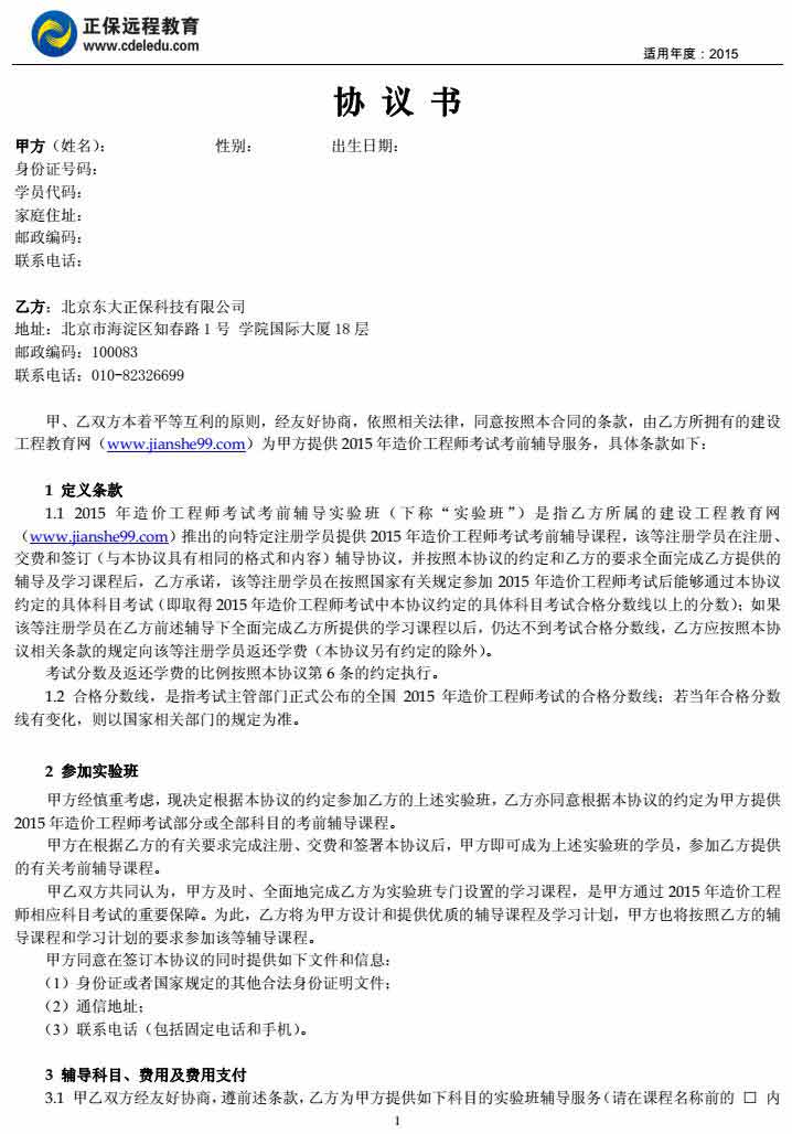 造價工程師“實驗班”協(xié)議書