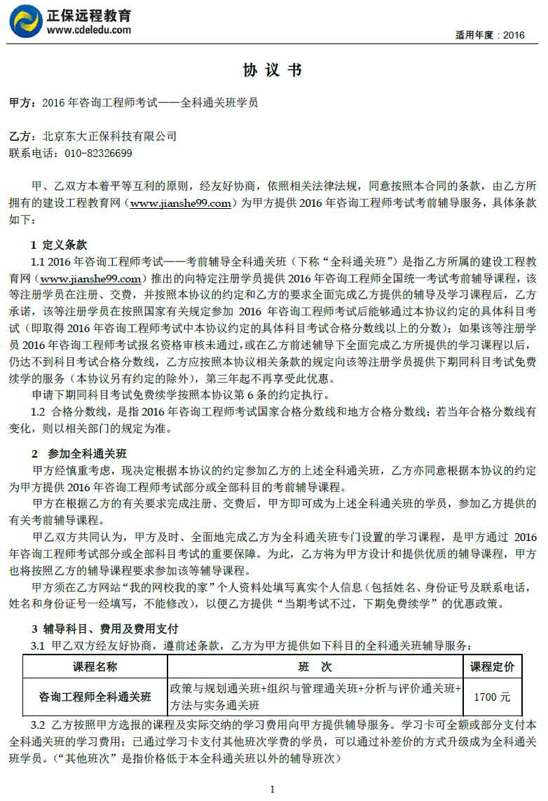 咨詢工程師“全科通關(guān)班”協(xié)議書