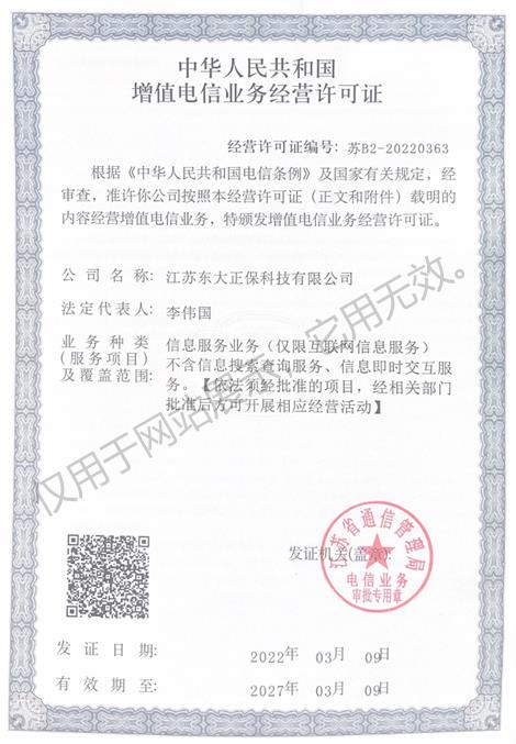 江蘇省通信管理局頒發(fā)的中華人民共和國增值電信業(yè)務(wù)經(jīng)營許可證,蘇B2-20220363