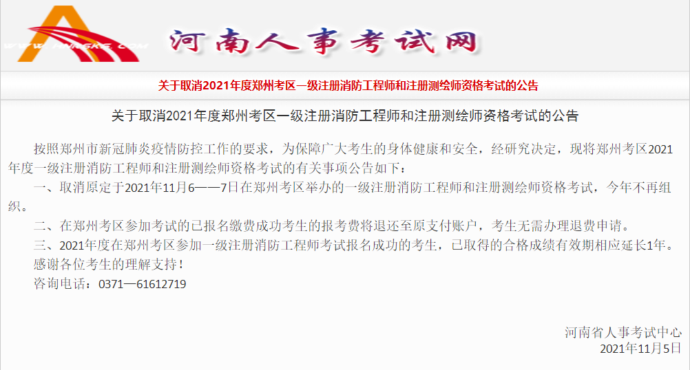 一、取消原定于2021年11月6——7日在鄭州考區(qū)舉辦的一級注冊消防工程師和注冊測繪師資格考試,今年不再組織。