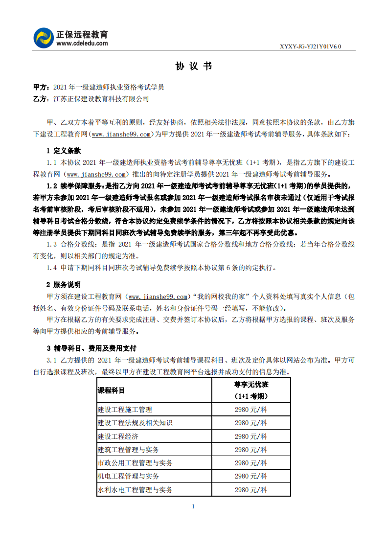 2021年一級(jí)建造師尊享無憂班續(xù)學(xué)協(xié)議書