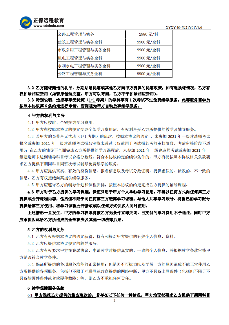 2021年一級建造師尊享無憂班續(xù)學(xué)協(xié)議書