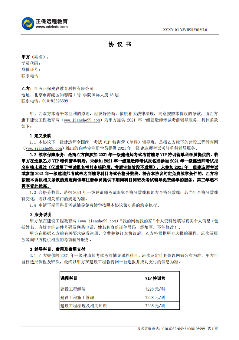 2021年一級建造師VIP特訓營(單科)協(xié)議書