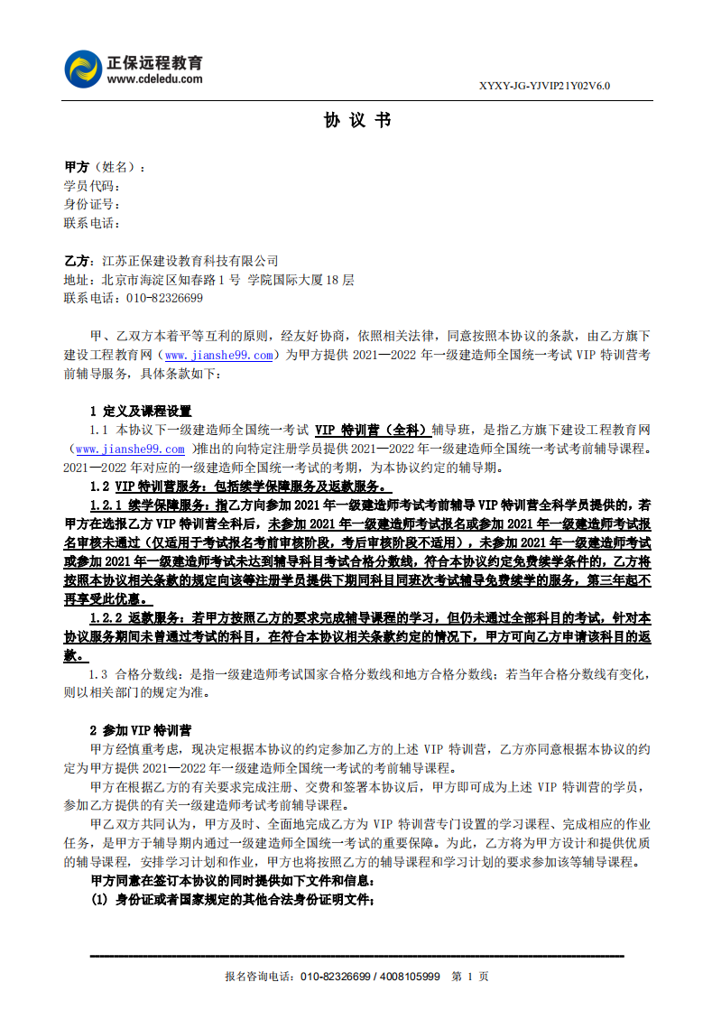 2021年一級建造師VIP特訓(xùn)營(全科)協(xié)議書