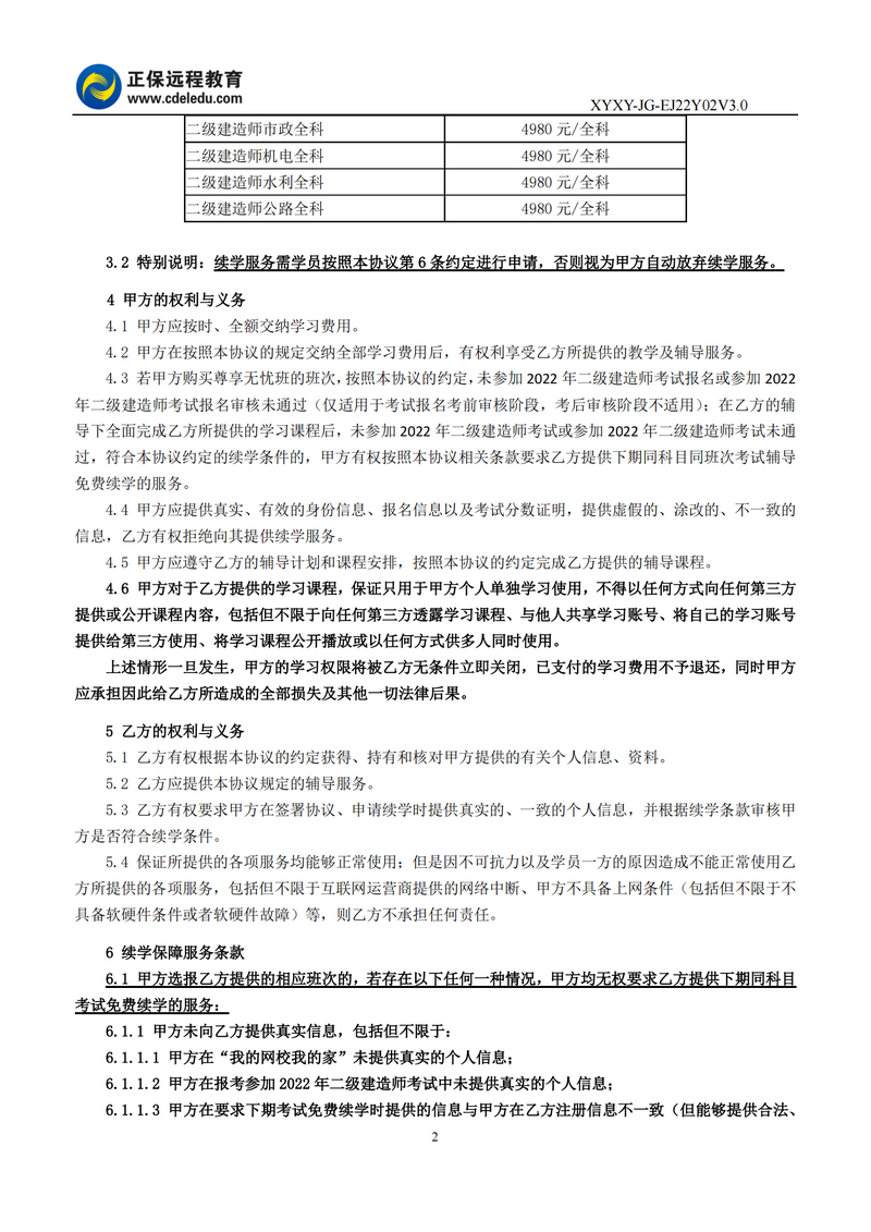 2022年二級(jí)建造師尊享無憂班協(xié)議書