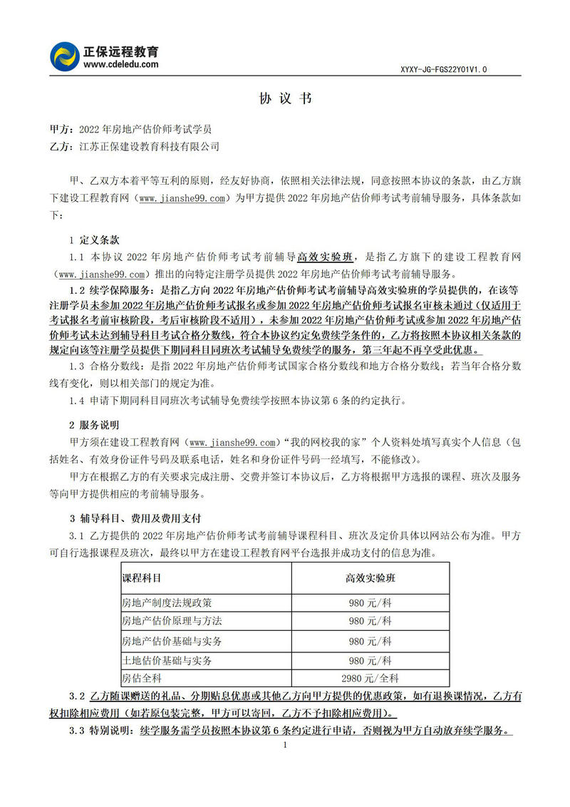 2022年房地產(chǎn)估價(jià)師高效實(shí)驗(yàn)班協(xié)議書(shū)