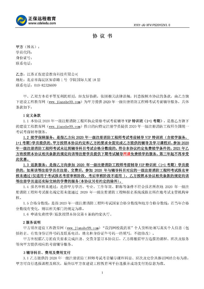 2020年一級注冊消防工程師VIP特訓(xùn)班協(xié)議書