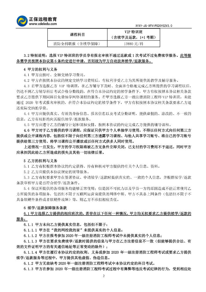 2020年一級注冊消防工程師VIP特訓(xùn)班協(xié)議書