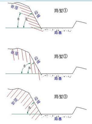 A. 路線走向與巖層的走向垂直,但巖層傾向與邊坡傾向相反時(shí)