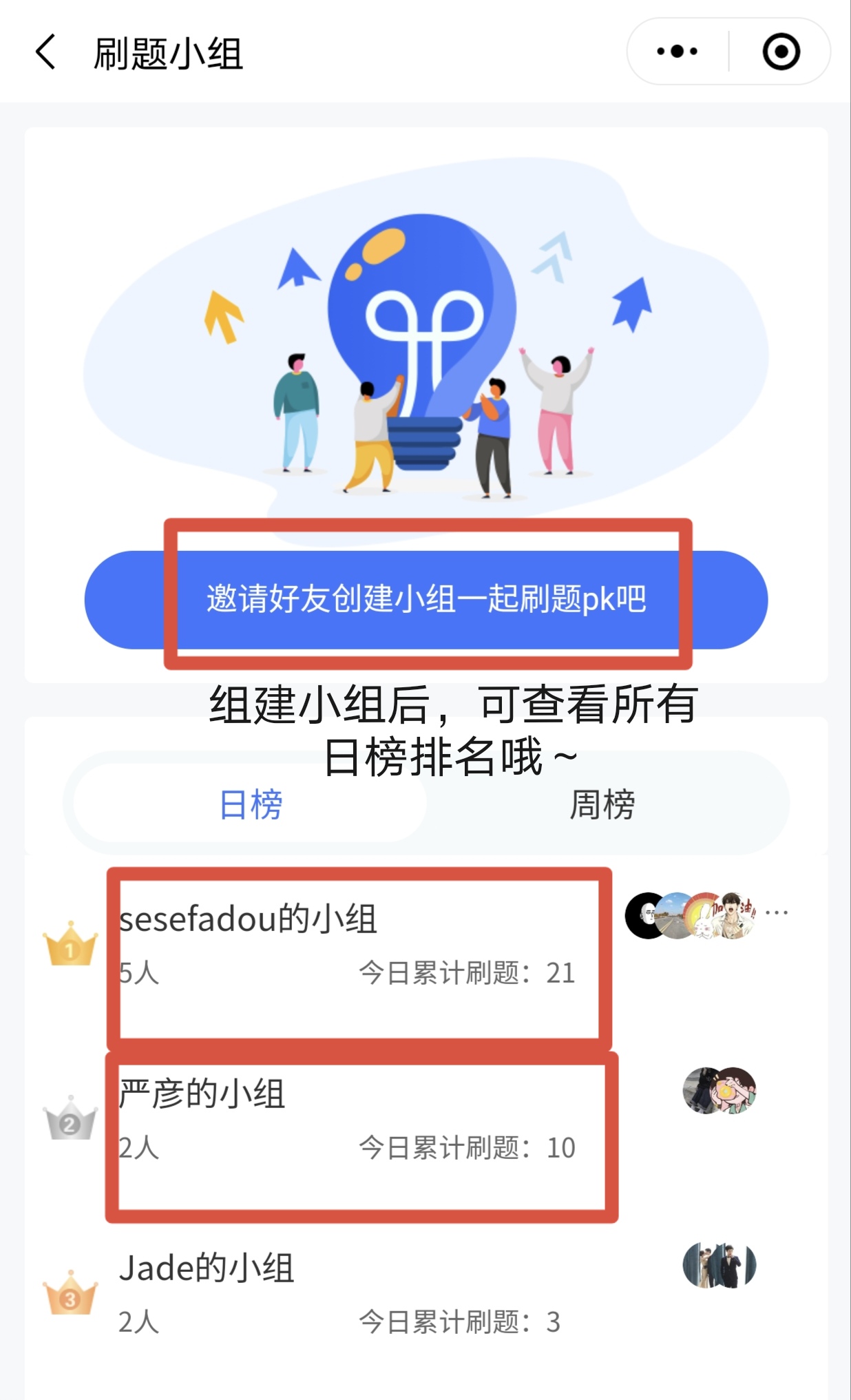 日榜周榜可看現(xiàn)有小組刷題戰(zhàn)績(jī)!