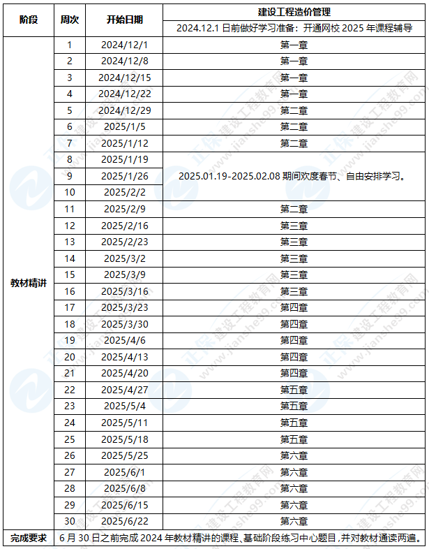 1、整體進(jìn)度說(shuō)明:本計(jì)劃表從2024年12月1日開始執(zhí)行,計(jì)劃于2025年6月30日結(jié)束,共計(jì)30周;其中:教材精講階段安排27周,春節(jié)調(diào)整階段3周。學(xué)員可根據(jù)本表的提示,結(jié)合自己的工作,學(xué)習(xí)情況進(jìn)行細(xì)化,并按網(wǎng)校要求完成聽課、做題的學(xué)習(xí)任務(wù),基本可滿足考試需要。