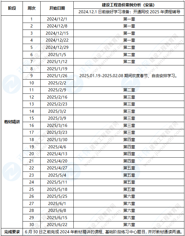 1、整體進(jìn)度說(shuō)明:本計(jì)劃表從2024年12月1日開(kāi)始執(zhí)行,計(jì)劃于2025年6月30日結(jié)束,共計(jì)30周;其中:教材精講階段安排27周,春節(jié)調(diào)整階段3周。學(xué)員可根據(jù)本表的提示,結(jié)合自己的工作,學(xué)習(xí)情況進(jìn)行細(xì)化,并按網(wǎng)校要求完成聽(tīng)課、做題的學(xué)習(xí)任務(wù),基本可滿足考試需要。