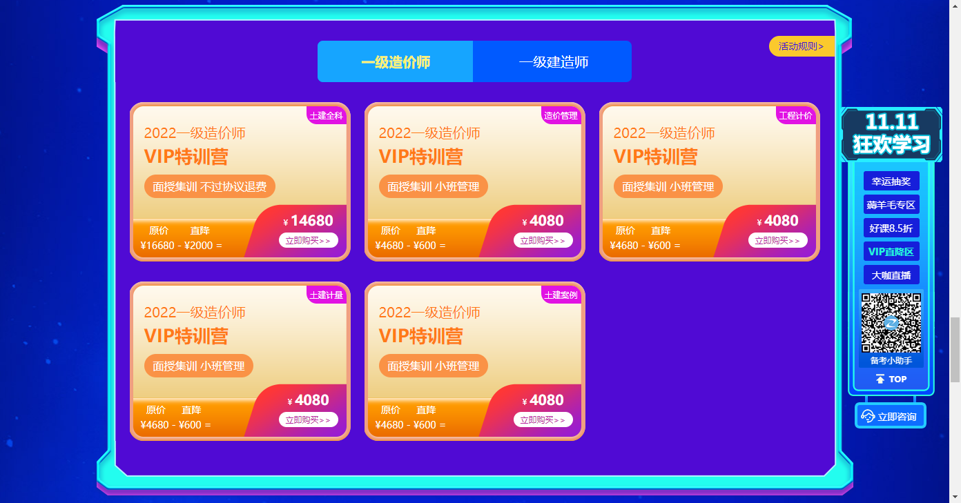 11月10日-11月11日,一級(jí)造價(jià)師VIP特訓(xùn)營(yíng)全科直降2000元,單科直降600元,僅限48小時(shí)!