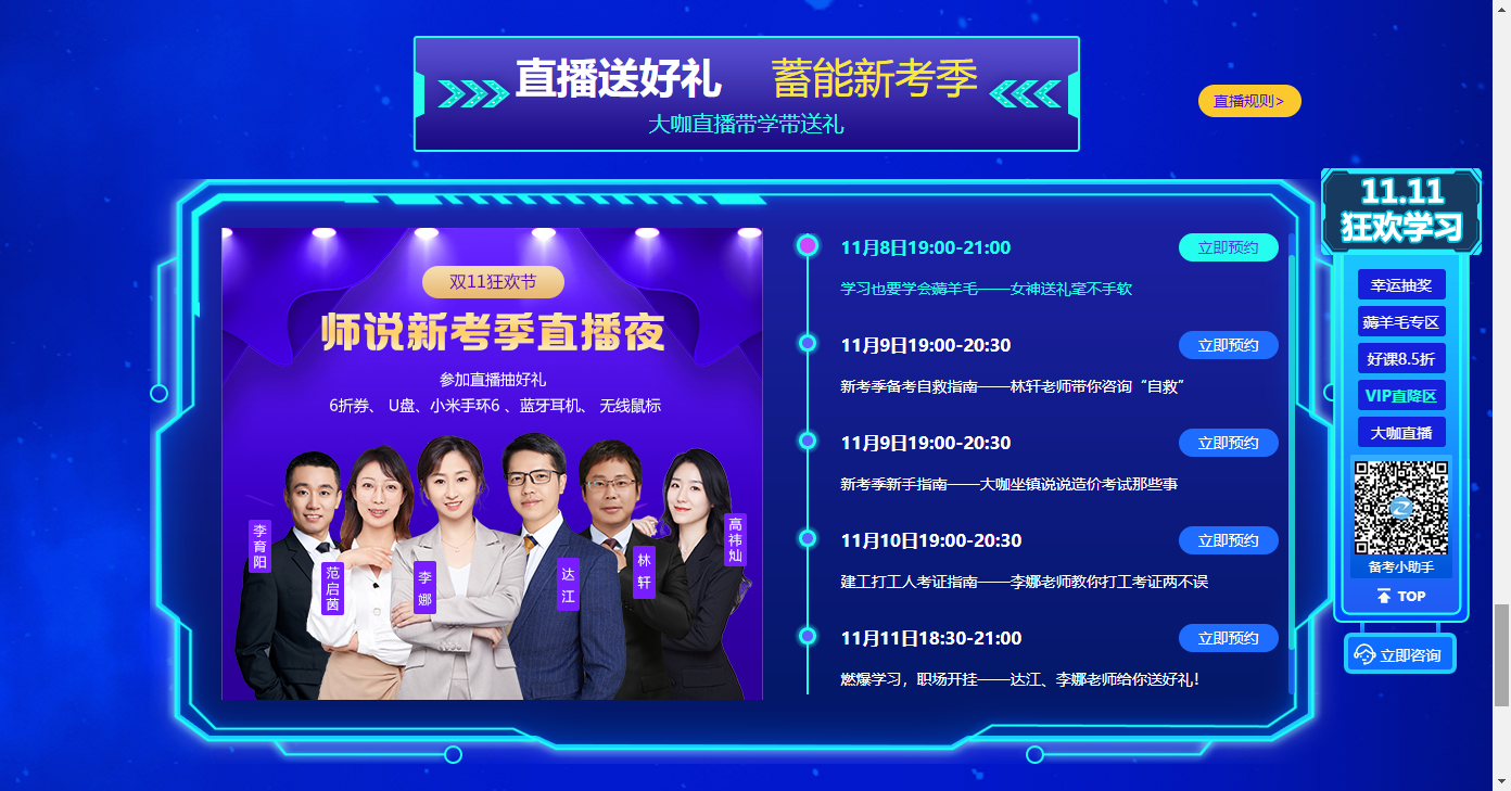 看直播抽好禮,6折券、U盤、小米手環(huán)、藍(lán)牙耳機(jī)、無(wú)線鼠標(biāo),助力新考季開掛!11月9日、10日、11日、每晚19點(diǎn)起,老師們直播間等你,不見不散哦~立即去預(yù)約>>