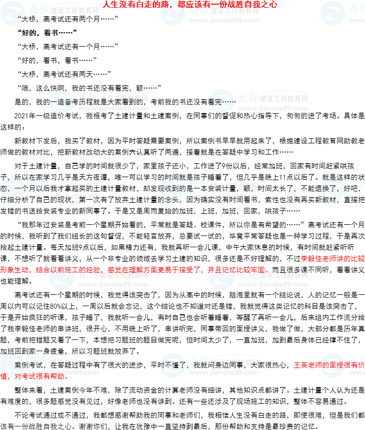 2021年一級造價師考試已經(jīng)結(jié)束,建設(shè)工程教育網(wǎng)在這個考試結(jié)束之際,推出了“我的造價備考之路”有獎?wù)魑幕顒樱∧阃陡逦野l(fā)獎,在這個考完的放松時刻,讓你說出你的備考心得,分享你的備考醫(yī)路,在此小編為大家整理參與活動的投稿內(nèi)容,一起分享大家的備考感悟與心得:
