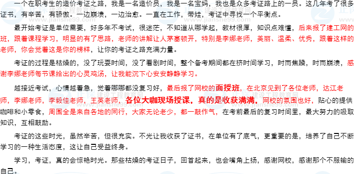 2021年一級(jí)造價(jià)師考試已經(jīng)結(jié)束,建設(shè)工程教育網(wǎng)在這個(gè)考試結(jié)束之際,推出了“我的造價(jià)備考之路”有獎(jiǎng)?wù)魑幕顒?dòng)!你投稿我發(fā)獎(jiǎng),在這個(gè)考完的放松時(shí)刻,讓你說出你的備考心得,分享你的備考醫(yī)路,在此小編為大家整理參與活動(dòng)的投稿內(nèi)容,一起分享大家的備考感悟與心得: