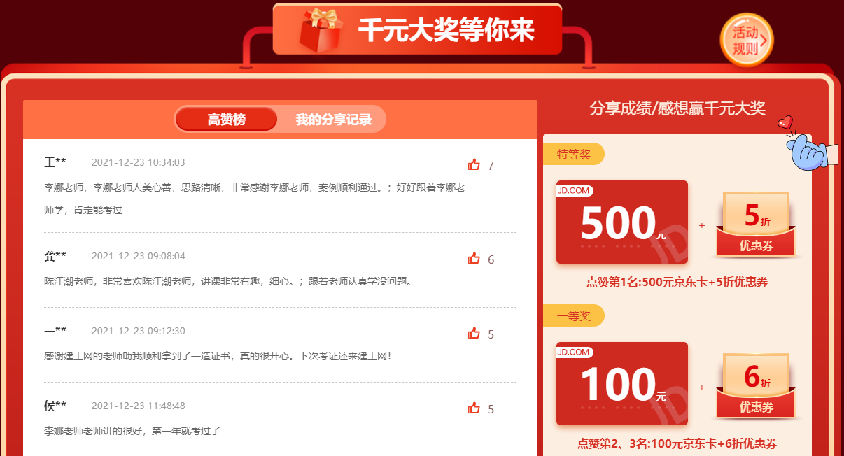 回望一年的一造備考之旅,這其中有艱辛、有汗水、有努力……,如此珍貴的備考經(jīng)驗(yàn)當(dāng)然應(yīng)該分享出來,快來參與網(wǎng)校一造備考成績/感想,點(diǎn)贊最高的可獲得:500元京東卡+5折優(yōu)惠券!猛戳進(jìn)入分享通道>>