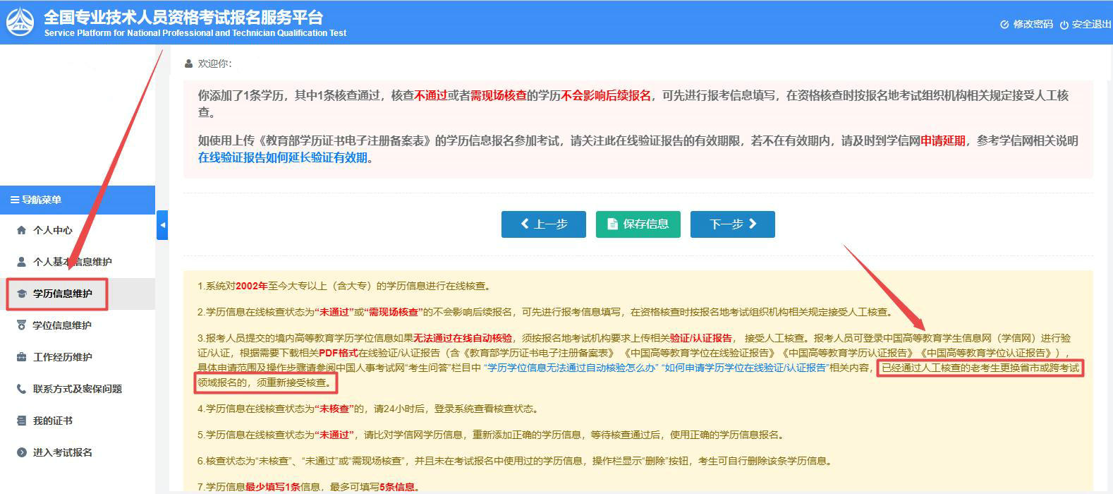 近日,中國(guó)人事考試網(wǎng)網(wǎng)上報(bào)名系統(tǒng)“全國(guó)專業(yè)技術(shù)人員資格考試報(bào)名服務(wù)平臺(tái)”-“學(xué)歷信息維護(hù)”頁(yè)面新增一條規(guī)定:已經(jīng)通過(guò)人工核查的老考生更換省市或跨考試領(lǐng)域報(bào)名的,須重新接受核查。詳情如下: