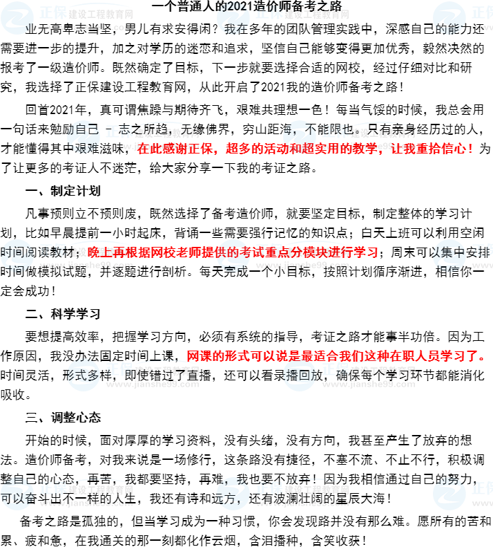 2021年一級造價師考試已經(jīng)結(jié)束,建設(shè)工程教育網(wǎng)在這個考試結(jié)束之際,推出了“我的造價師備考之路”有獎?wù)魑幕顒樱∧阃陡逦野l(fā)獎,在這個考完的放松時刻,讓你說出你的備考心得,分享你的備考醫(yī)路,在此小編為大家整理參與活動的投稿內(nèi)容,一起分享大家的備考感悟與心得: