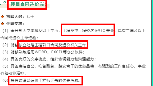 以下是某大型企業(yè)的招聘信息,招聘崗位是項(xiàng)目合同造價(jià)崗,最后任職要求里明確說到持有一級(jí)造價(jià)工程師證書的會(huì)被優(yōu)先考慮,所以這也足以說明這個(gè)證書是有一定優(yōu)勢(shì)的。