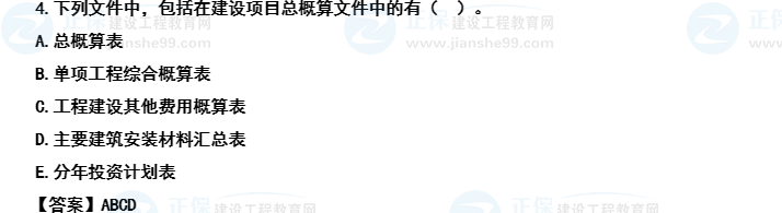 選項E分年投資計劃表不屬于總概算文件的內(nèi)容,屬于投資估算文件的編制內(nèi)容。