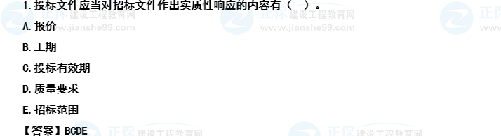 【解析】本題考查的是編制投標文件。投標文件應當對招標文件有關工期、投標有效期、質(zhì)量要求、技術標準和要求、招標范圍等實質(zhì)性內(nèi)容作出響應。參見教材P211。