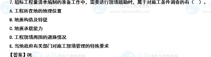 【解析】本題考查的是招標工程量清單的編制。施工條件:工程現(xiàn)場周圍的道路、進出場條件、交通限制情況;工程現(xiàn)場施工臨時設施、大型施工機具、材料堆放場地安排情況;工程現(xiàn)場鄰近建筑物與招標工程的間距、結構形式、基礎埋深、新舊程度、高度;市政給排水管線位置、管徑、壓力,廢水、污水處理方式,市政、消防供水管道管徑、壓力、位置等;現(xiàn)場供電方式、方位、距離、電壓等;工程現(xiàn)場通信線路的連接和鋪設;當?shù)卣嘘P部門對施工現(xiàn)場管理的一般要求、特殊要求及規(guī)定等。選項A、B、C屬于對自然地理條件的調(diào)查。參見教材P186。