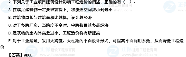 (1)選項B,描述是正確的。建筑物周長與建筑面積比是建筑周長系數(shù),建筑周長系數(shù)越低設計越經(jīng)濟。拓展一點:降低建筑周長系數(shù)充分注意建筑平面形狀的簡潔、布局的合理,從而降低工程造價。