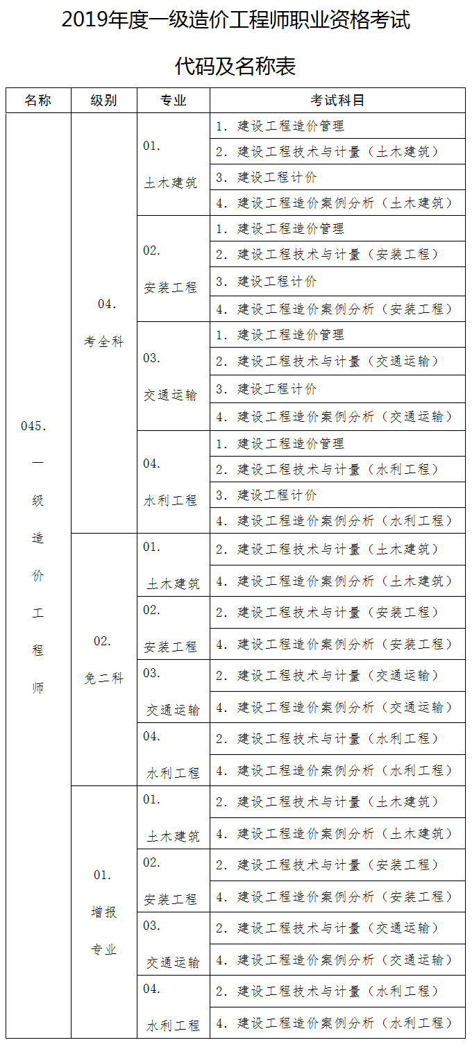 2.2019年度一級(jí)造價(jià)工程師職業(yè)資格考試代碼及名稱表