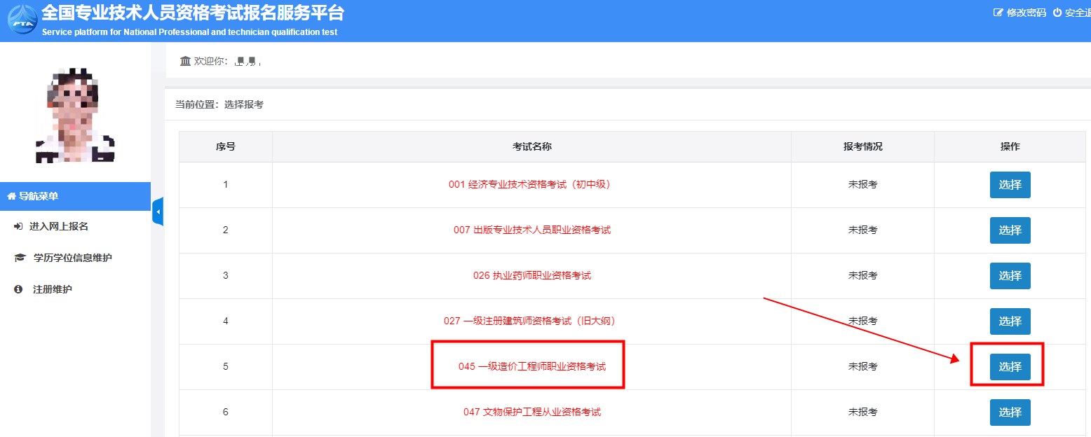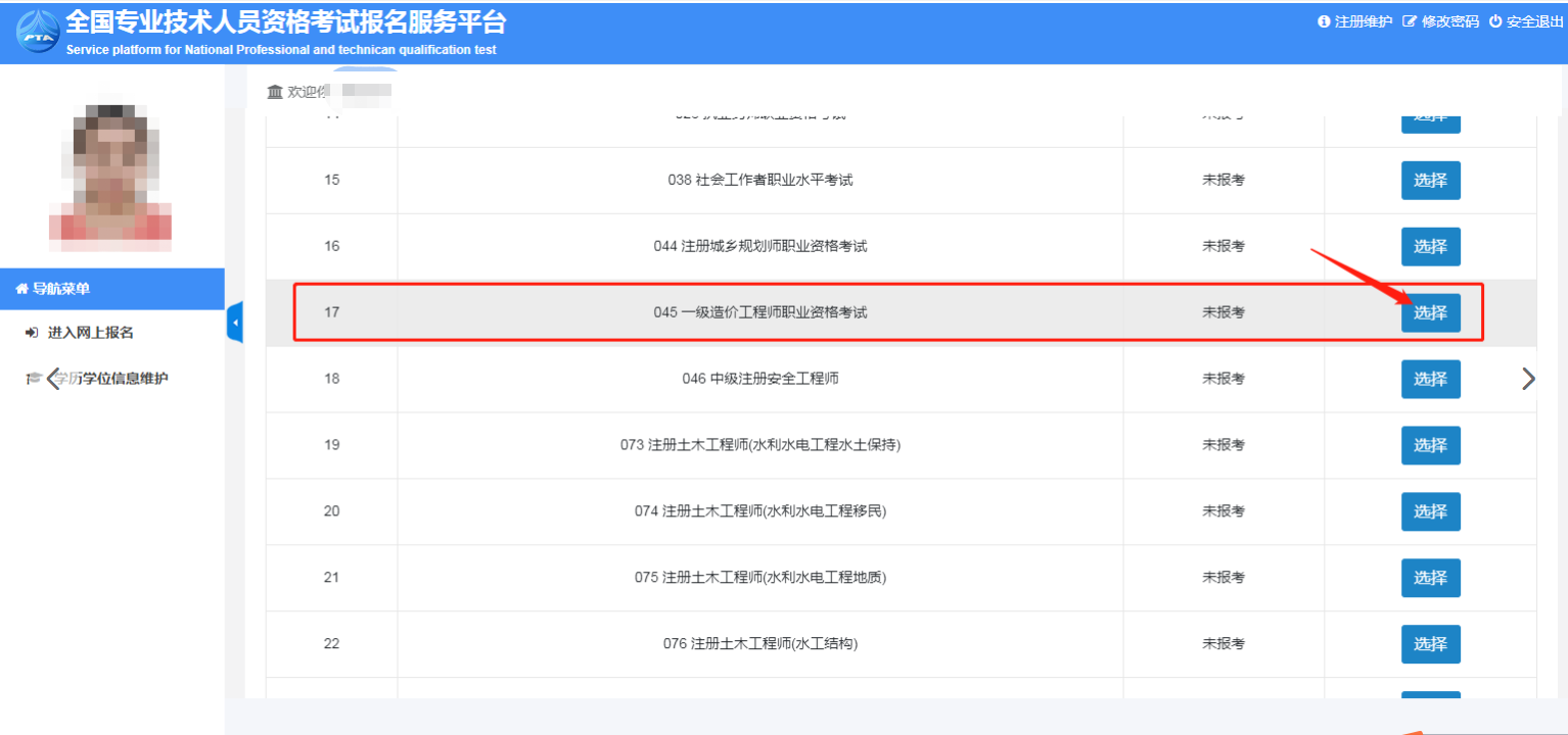 3.登錄“網(wǎng)報(bào)系統(tǒng)”后,下拉找到“045一級造價(jià)工程師職業(yè)資格考試”,點(diǎn)擊“選擇”