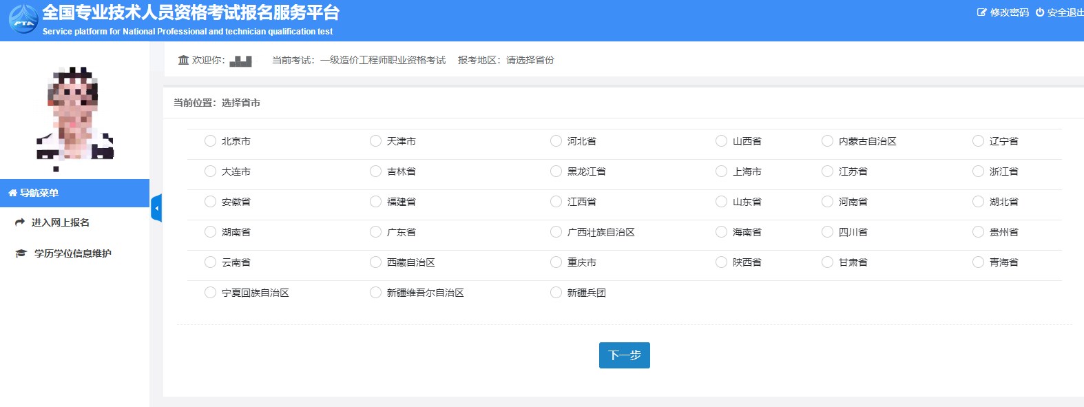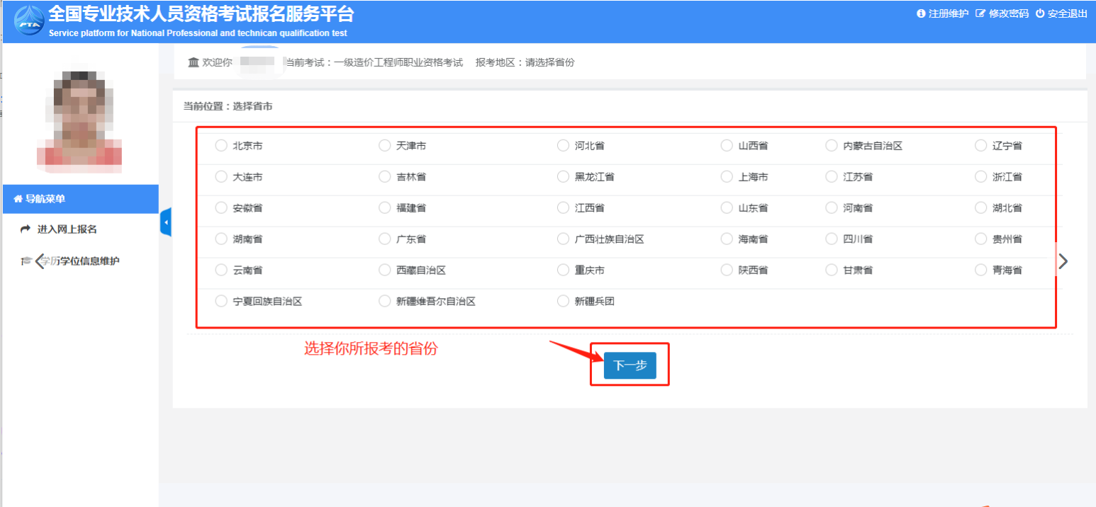 4.進(jìn)入“選擇省份”頁面,選中你需要報(bào)考的省份,點(diǎn)擊“下一步”