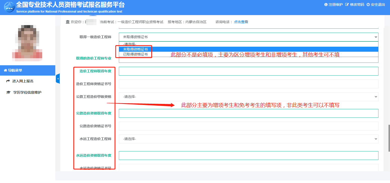 10.此部分內(nèi)容都沒帶*,為非必填項(xiàng),因?yàn)?span style="color: rgb(255, 0, 0);">這部分主要是針對增項(xiàng)考生和免考考生的,增項(xiàng)、免考考生需要選填。