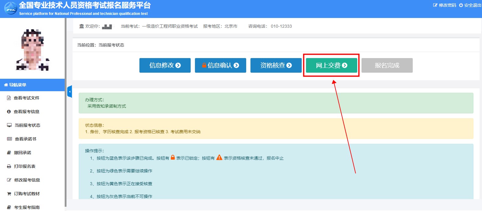 13.簽署完告知承諾書,即可看到自己的報(bào)名狀態(tài)。按鈕為藍(lán)色表示步驟已完成,按鈕為黃色表示正在接受核查,按鈕為綠色表示需要繼續(xù)操作。如果是正在接受核查但是考生,則需要時(shí)常登錄報(bào)名平臺看下資格審核是否通過,如果未通過則按照要求準(zhǔn)備證明材料,然后切記要在規(guī)定的繳費(fèi)時(shí)間內(nèi)繳納報(bào)名費(fèi)。像小編這種狀態(tài)的,直接繳納報(bào)名費(fèi)即可完成考試報(bào)名啦!
