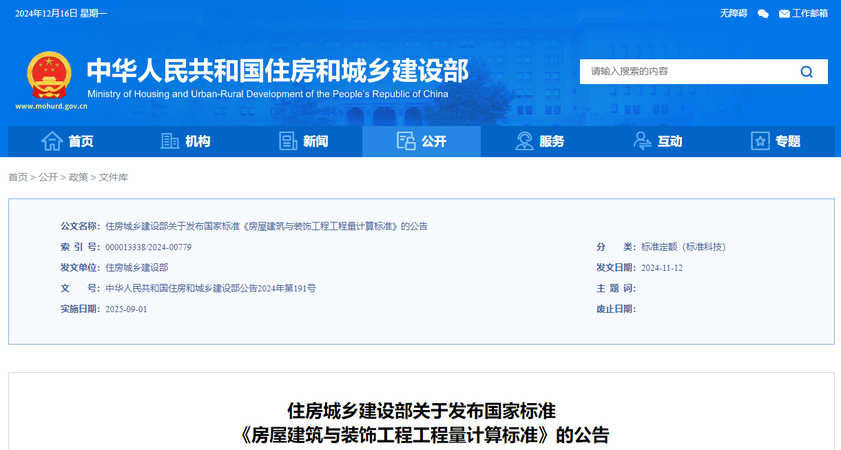住房城鄉(xiāng)建設(shè)部關(guān)于發(fā)布國(guó)家標(biāo)準(zhǔn)《房屋建筑與裝飾工程工程量計(jì)算標(biāo)準(zhǔn)》的公告