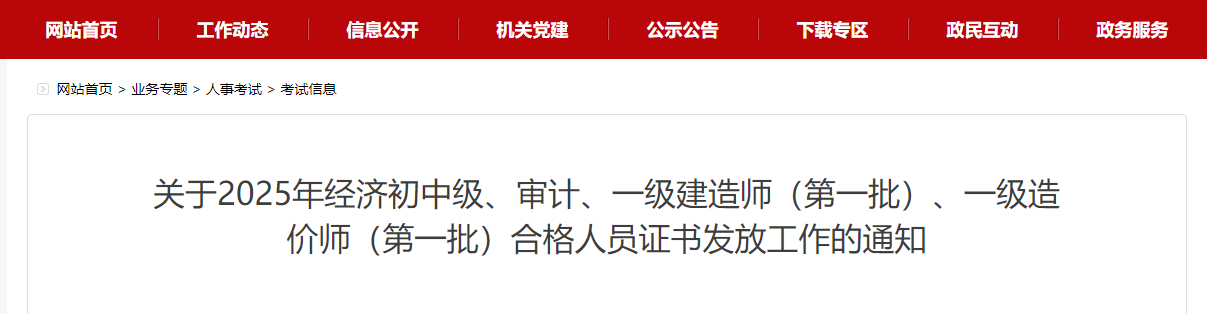關(guān)于2025年經(jīng)濟(jì)初中級、審計(jì)、一級建造師(第一批)、一級造價師(第一批)合格人員證書發(fā)放工作的通知