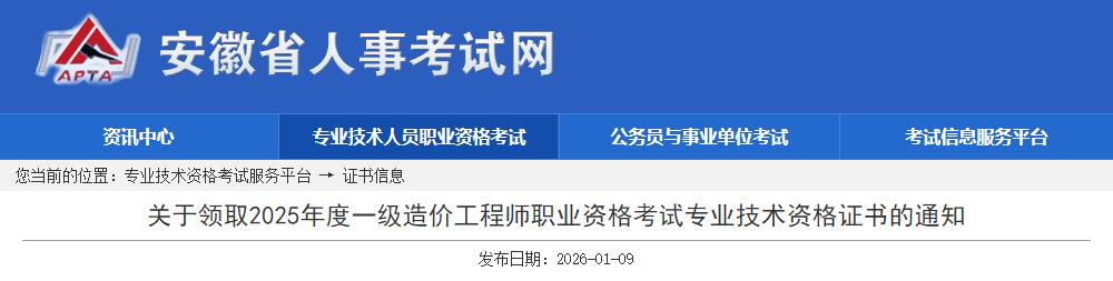 安徽省2025年度一級(jí)造價(jià)工程師證書領(lǐng)取通知