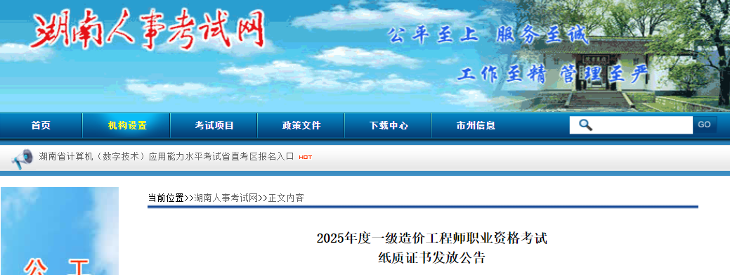 湖南省2025年度一級(jí)造價(jià)工程師職業(yè)資格考試紙質(zhì)證書(shū)發(fā)放公告