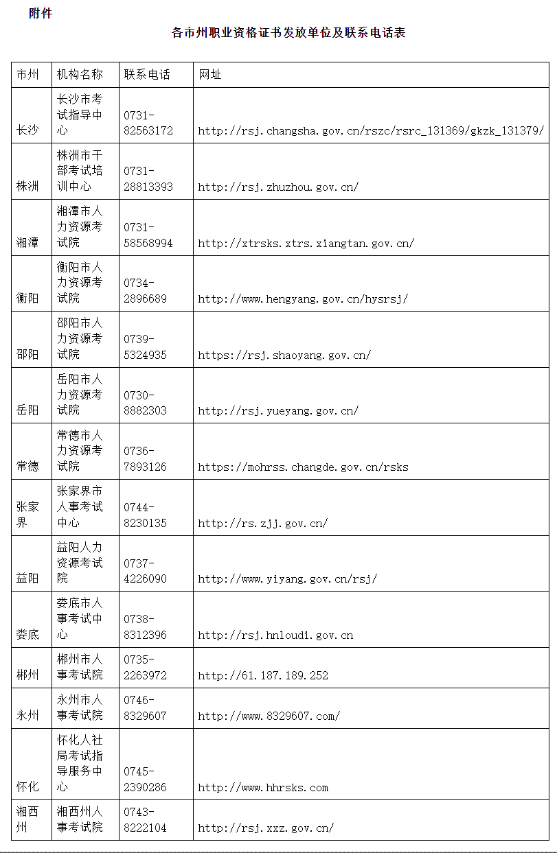 附件:各市州職業(yè)資格證書(shū)發(fā)放單位及聯(lián)系電話表