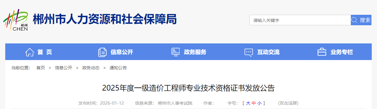 湖南郴州2025年度一級(jí)造價(jià)工程師專(zhuān)業(yè)技術(shù)資格證書(shū)發(fā)放公告