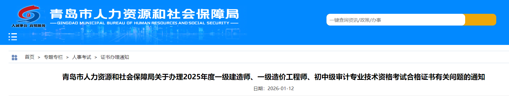 青島市人力資源和社會(huì)保障局關(guān)于辦理2025年度一級建造師、一級造價(jià)工程師、初中級審計(jì)專業(yè)技術(shù)資格考試合格證書有關(guān)問題的通知