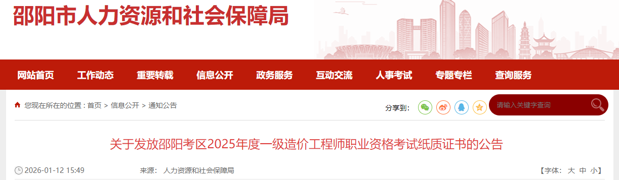 湖南省邵陽考區(qū)2025年一級(jí)造價(jià)師考試證書發(fā)放通知