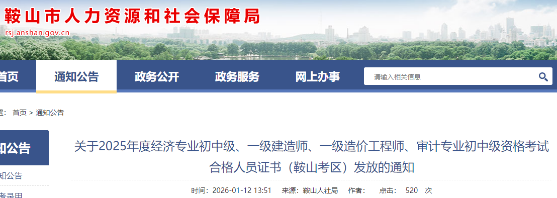 關(guān)于2025年度經(jīng)濟(jì)專業(yè)初中級、一級建造師、一級造價工程師、審計專業(yè)初中級資格考試合格人員證書(鞍山考區(qū))發(fā)放的通知