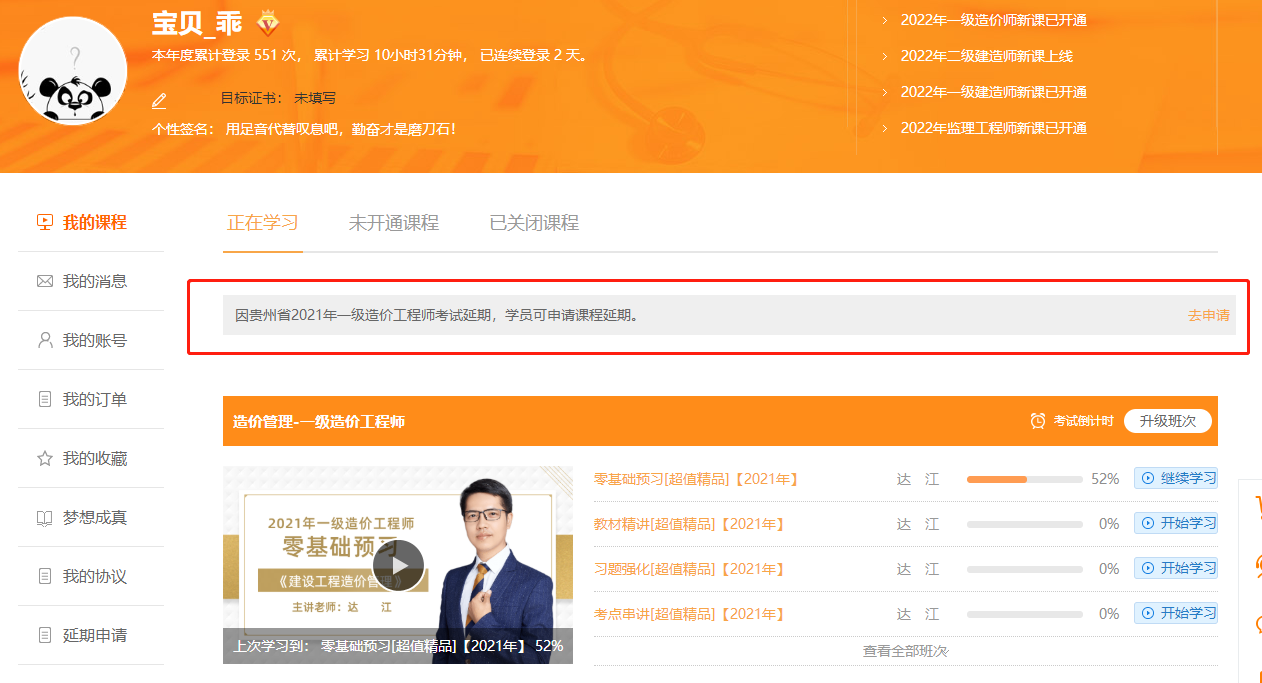 之前已經(jīng)報名網(wǎng)校2021年一級造價師考試課程的同學(xué)不用擔(dān)心可以申請延期課程了,入口在“我的網(wǎng)校我的家”,請大家及時申請,不要錯過。