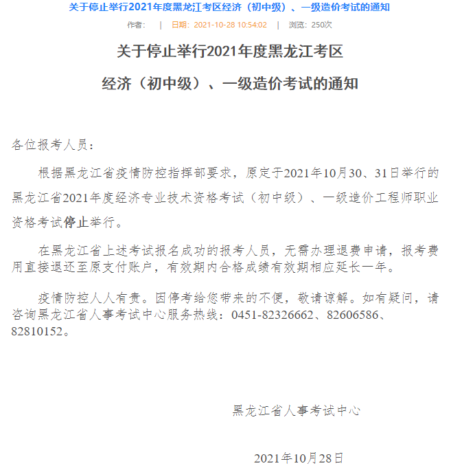 關(guān)于停止舉行2021年度黑龍江考區(qū)