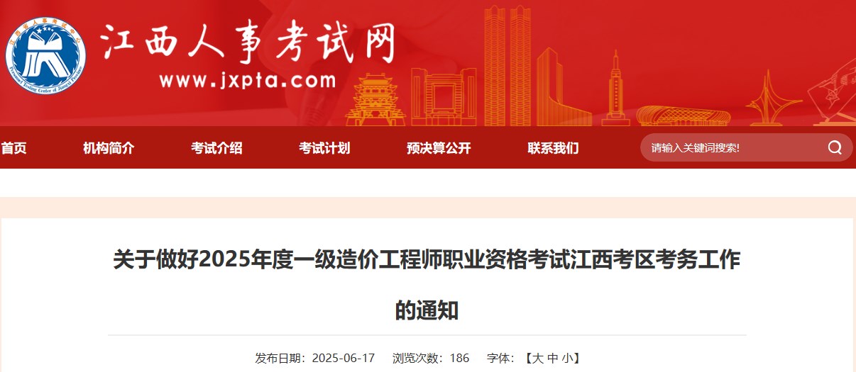 根據(jù)《人力資源社會保障部辦公廳關(guān)于2025年度專業(yè)技術(shù)人員職業(yè)資格考試計劃及有關(guān)事項的通知》(人社廳發(fā)〔2025〕1號)以及《人力資源社會保障部人事考試中心關(guān)于2025年度一級造價工程師職業(yè)資格考試考務(wù)工作的通知》(人考中心函〔2025〕22號)精神,為做好2025年度一級造價工程師職業(yè)資格考試江西考區(qū)考務(wù)工作,現(xiàn)將有關(guān)事項通知如下: