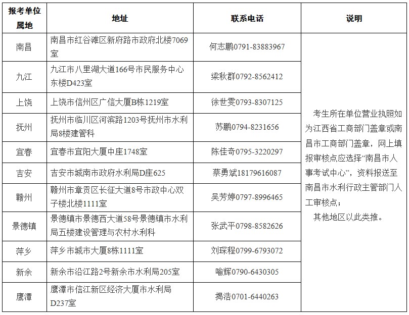 報考水利工程專業(yè)的應(yīng)試人員按單位屬地將材料報送到各設(shè)區(qū)市水利行政主管部門現(xiàn)場人工核查點(附件4)。