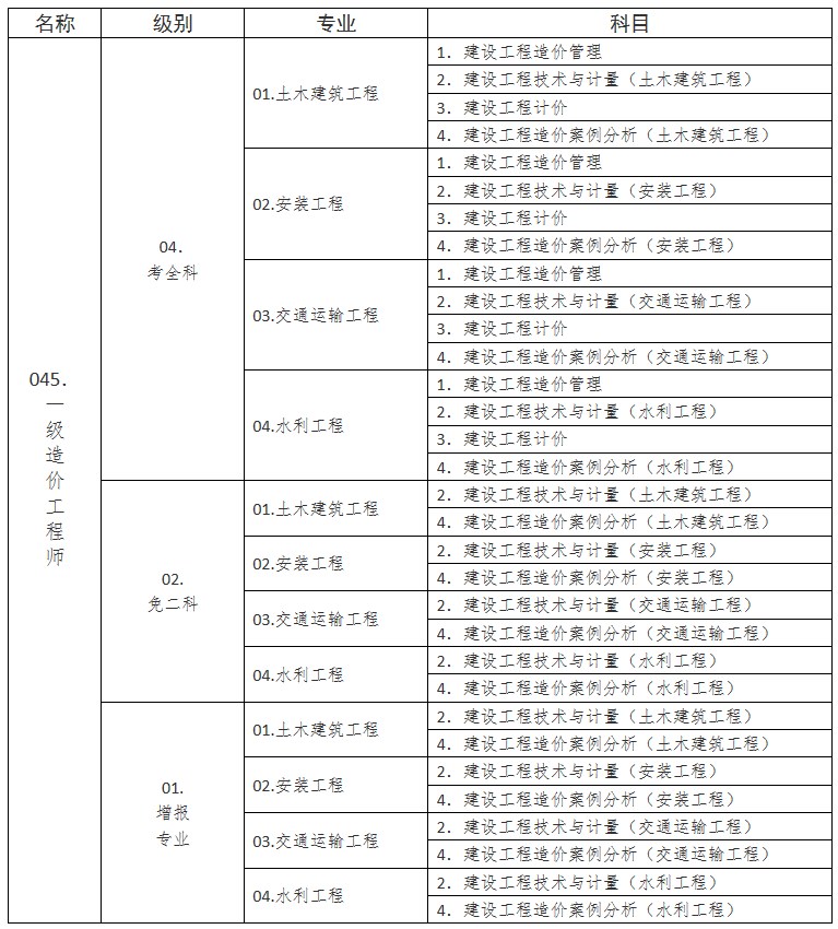 一級造價工程師職業(yè)資格考試代碼及名稱表