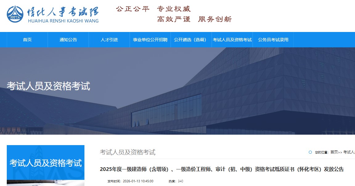2025年度一級建造師(含增項)、一級造價工程師、審計(初、中級)資格考試紙質(zhì)證書(懷化考區(qū))發(fā)放公告